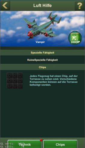 Sie können im Flugzeug Laden neue Flugzeuge kaufen. Neue Flugzeuge haben neue spezielle Fähigkeiten und Attribute.