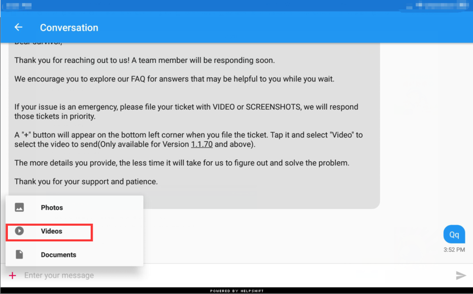 When you send the message, a “+” button will appear on the bottom left corner. Tap it and select Video to select the video to send.
