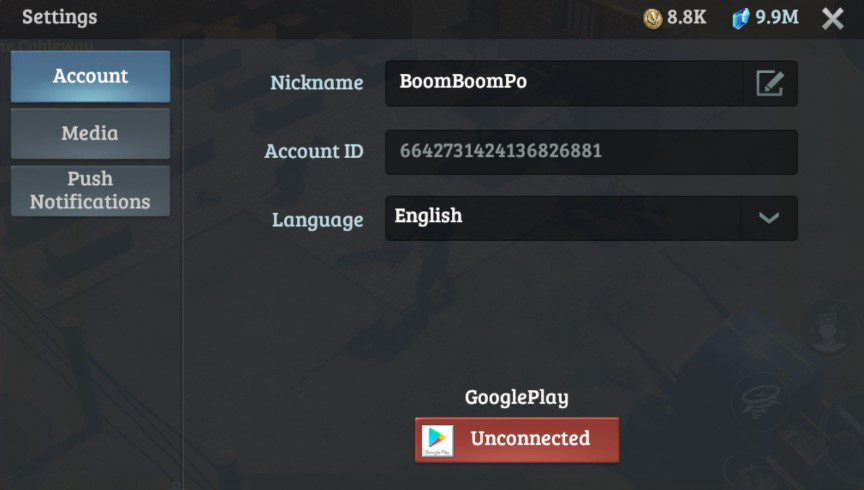 On Account Setting page, You can change your character’s Nickname and Game Language, also link your Google Play account.