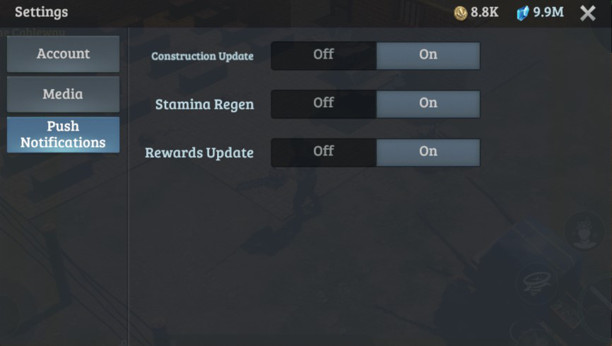 In push notification settings, you can choose to turn on push notifications for certain functions (such as completion of facilities and stamina recovery).