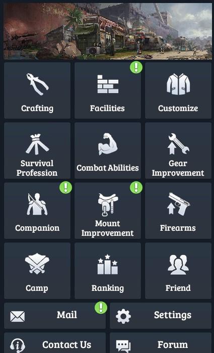 The main menu contains various feature tabs including crafting, Facilities, Combat Abilities, Companions, Firearms etc.