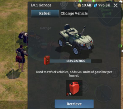 You have to reach a certain level to unlock Garage in Build Mode. After you unlock and build a Garage in your home, you can use it to refuel your ATV. Go near the Garage and tap interaction button to enter the Garage page, and you can tap Refuel to refuel the ATV. It costs fuel tanks to refuel the ATV.