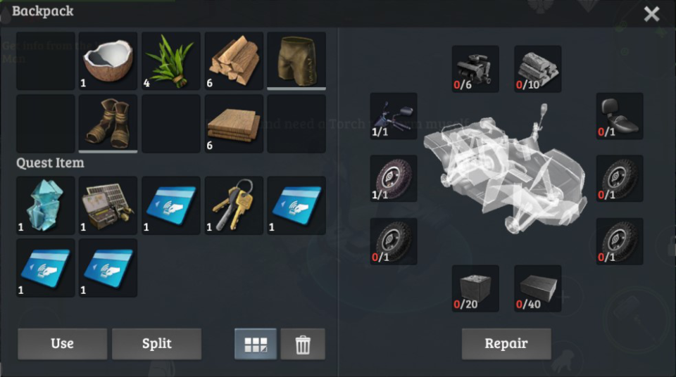 Pick up the parts up in the field and take them back to your home. Go near the ATV and tap the Repair button to add and install parts.