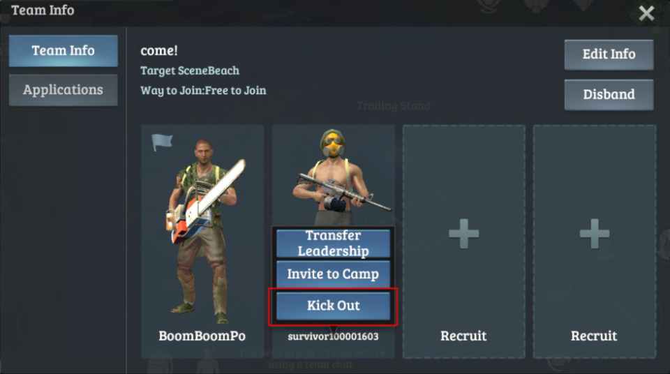 When you are the team leader and you want to kick out a team member, you can tap the selected team member and then tap the Kick Out button to kick him or her out of the team.