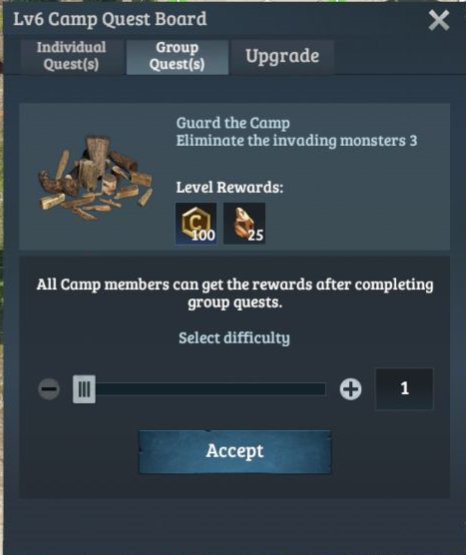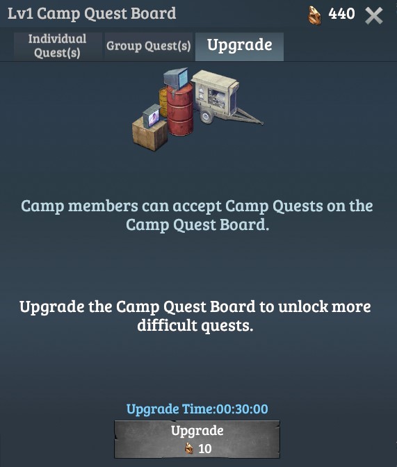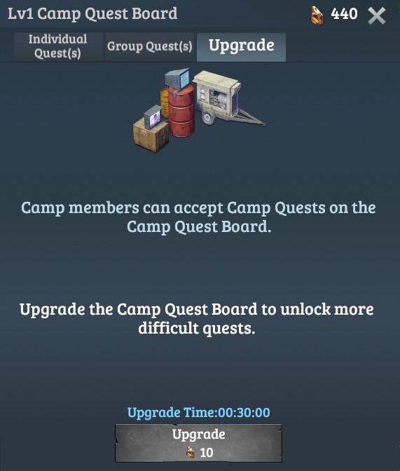Upgrade Camp Quest Board to unlock Camp Quests of higher difficulty.