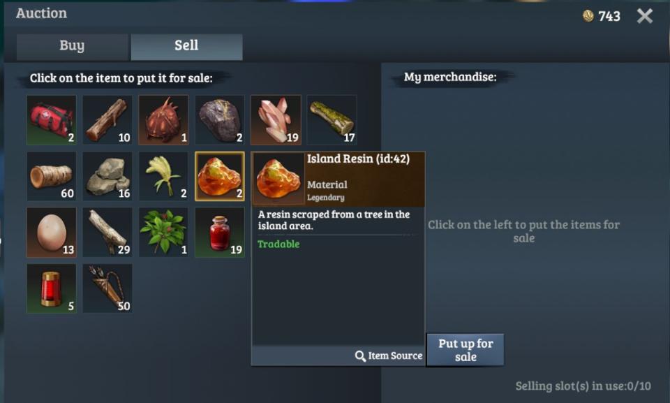 On the Sell tab, you can choose items from your backpack or storage crates and put them up for sale.