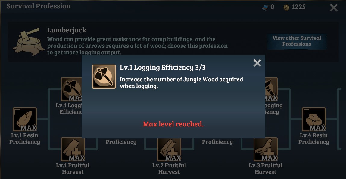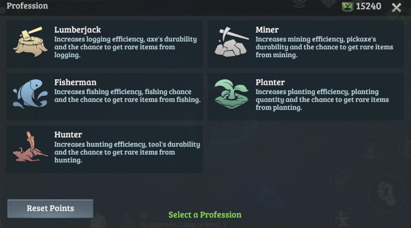 Take Lumberjack for example. You can learn talents about logging after choosing Lumberjack for profession, to efficiently improve your logging abilities. It takes Profession Skill Points to learn talents. Profession skill point grows over time.