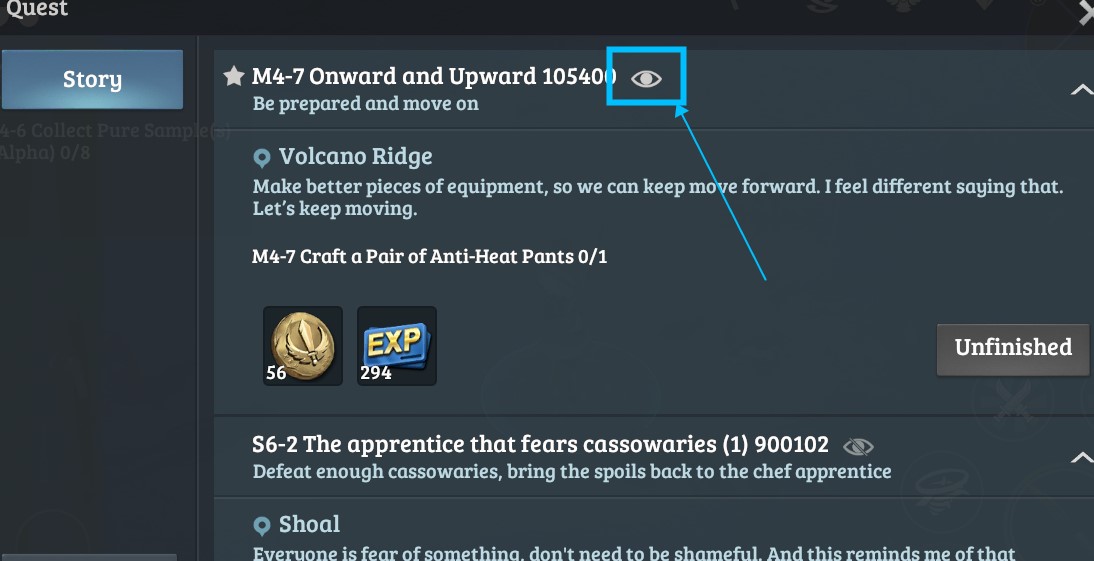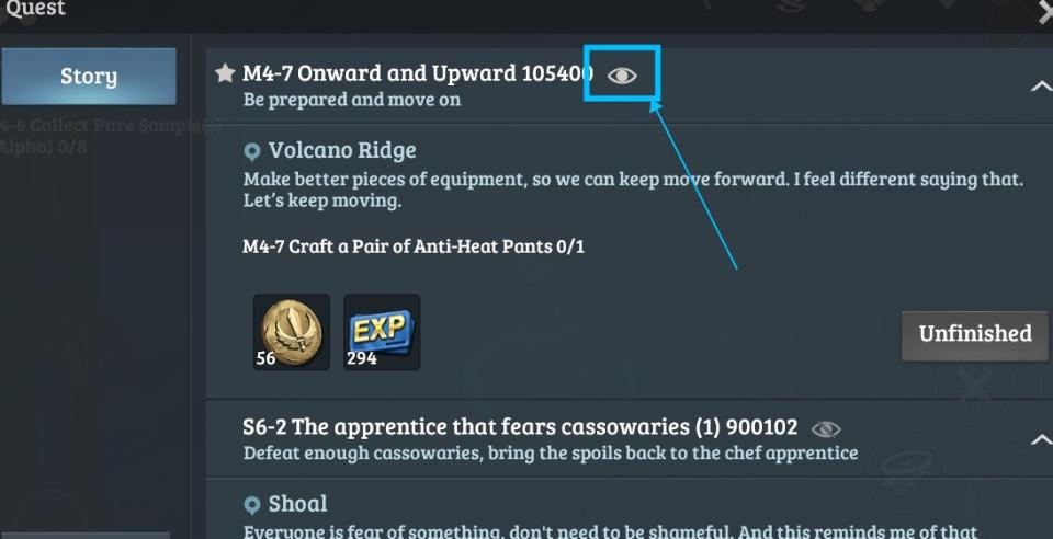 Afterwards, you can tap the "Eye" icon to display or hide quests in your main game screen.