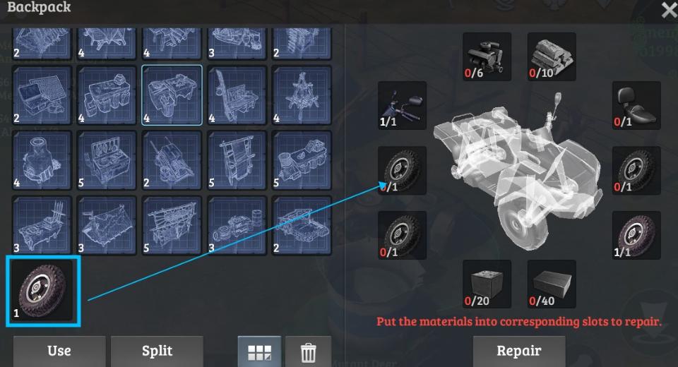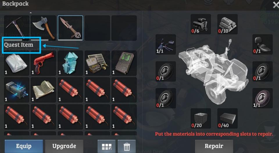 To assemble your ATV, you will need to search the entire map (All scenes) for the ATV parts and then bring them back to your home camp. Once you have at least one part, simply walk toward your ATV and tap to open the assembling panel then drag the parts from your Quest Item bag to the slots of the corresponding slots on the ATV.