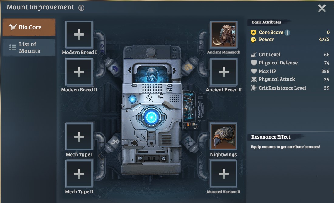 Mounts slotted in the Bio Core can trigger different resonance effect. ie. When Triceratops and Flame Velociraptor are both equipped, their mood decrease rate is reduced by 5%.
