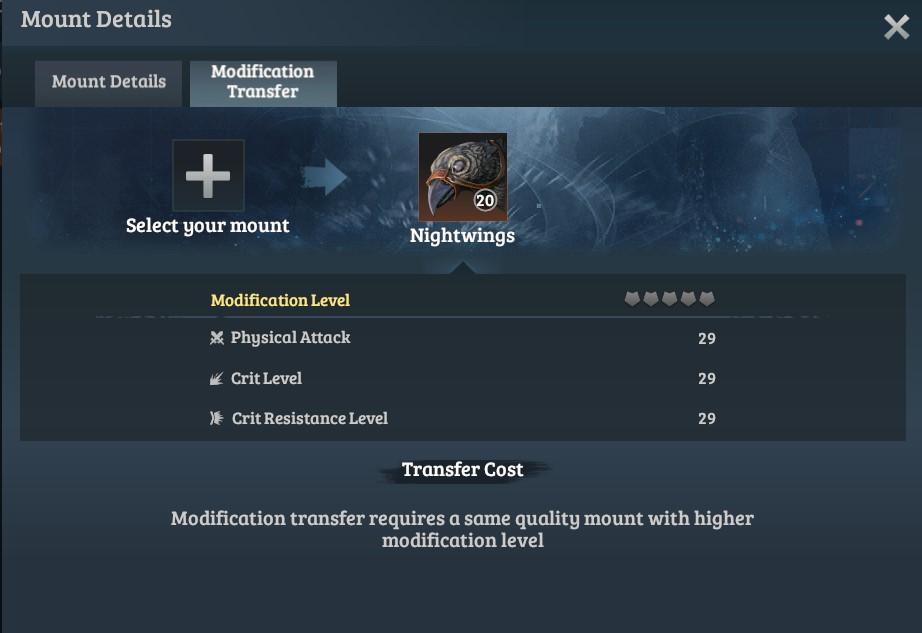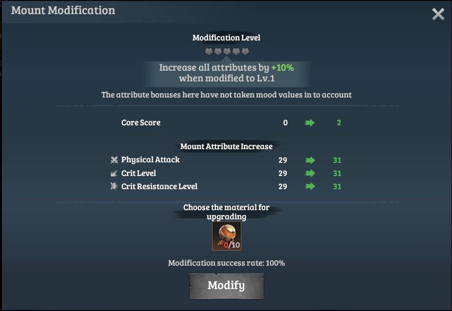Mount modification, which goes up to level 10, can increase the attributes provided by the mount along with its core score.