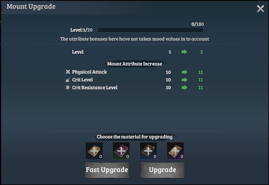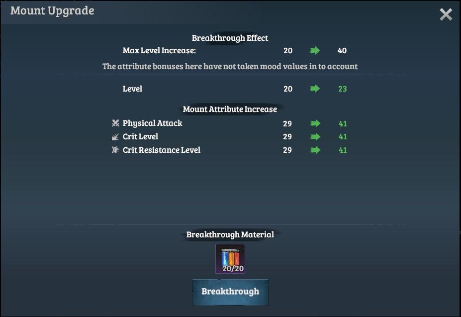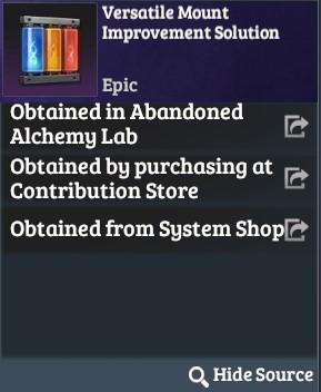 At certain level intervals, you need to use Versatile Mount Improvement Solution to increase mount’s level limit. These can be obtained from the Abandoned Alchemy Lab, Contribution Store and the System Shop.