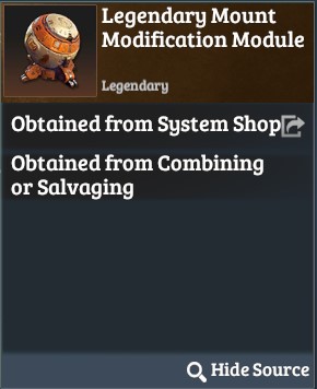 Mount modification modules of their corresponding qualities, which can be obtained from the system shop or through salvaging, are required for modification process.