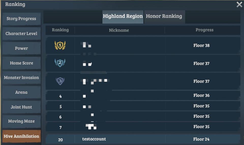 The icon on the bottom right of the page will bring you to the Hive Annihilation Leaderboard. There you can check the regional or global rankings of players. The ranks are based primarily on levels, and if two players have cleared the exact same level, whoever cleared it earlier are be placed higher.