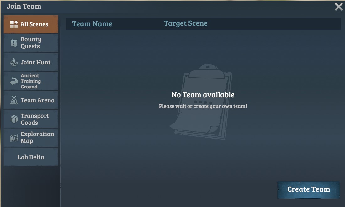 Tapping the Team List will bring up a list of available teams created by other players, with the left column serving as a filter based on Target Scene.
