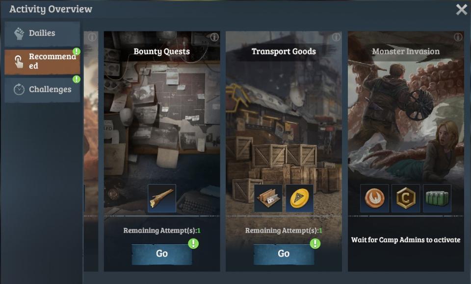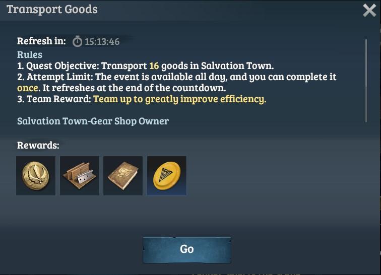 The details of Transport Goods can be viewed from the Get Gold tab under Activity Overview. To accept the quest, you need to find Rex in the Salvation Town and take it from there.