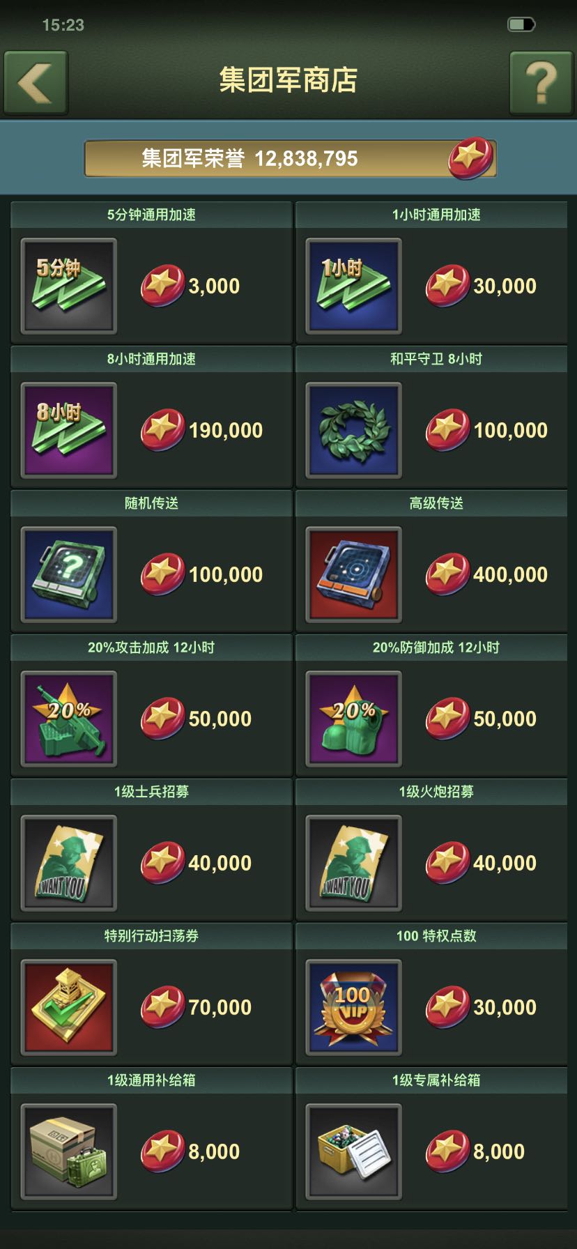 在集团军商店中,可以使用集团军荣誉兑换各种道具。