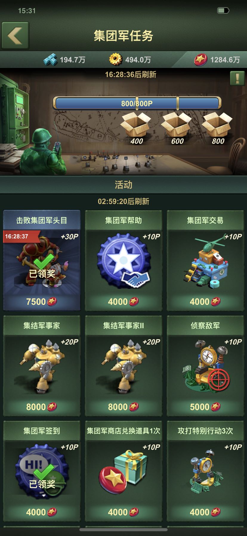 集团军每日任务每天零点(服务器时间)重置;