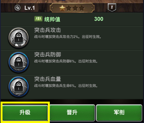 军官属性下方的升级按钮可进入升级功能