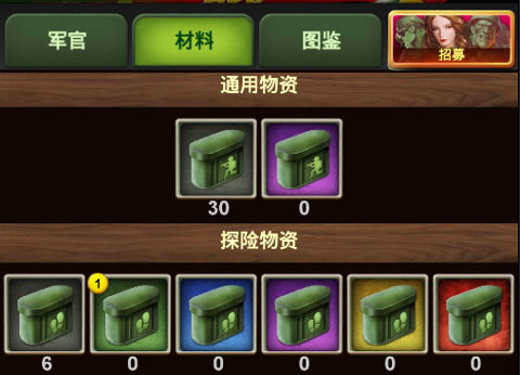 需要特别物资的种类与军官类型对应,分为探险物资、军事物资、防御物资、后勤物资、科技物资。