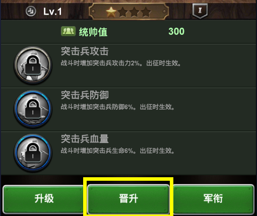 军官属性下方的晋升按钮可进入晋升功能