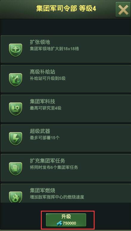 · 点击集团军司令部出现升级页面,消耗集团军物资进行升级