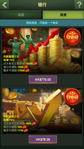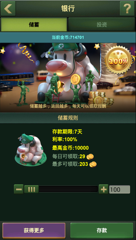 将金币存入银行,储蓄期限内每日连本带利返还一定数量的金币