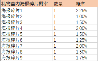 不同主题海报,海报各碎片获得概率不同。