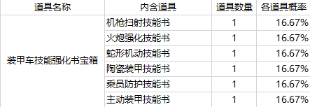 道具说明:使用后,随机获得机枪扫射技能书*100、火炮强化技能书*100、蛇形机动技能书*100、陶瓷装甲技能书*100、乘员防护技能书*100、主动装甲技能书*100中的一种