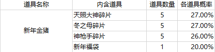 道具说明:使用后随机获得一个新年福袋或者所列军官(冬之母,天照大神,神枪手)中任一军官的5个碎片