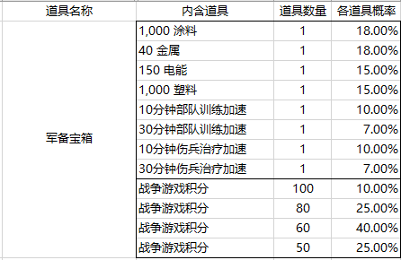 道具说明:使用后随机获得战争游戏活动50至100积分,并获得资源或加速等奖励