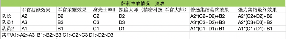 1、超级集结中萨莉死转伤技能:队员共享队长的军官技能效果和军官荣耀效果且若队员的这两个效果大于队长的,则取队员自己的;
