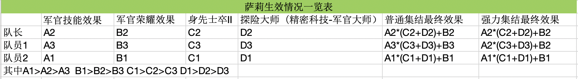 3、目前仅有身先士卒II(职业-暗夜杀手)+探险大师(精密科技-军官大师) 这两个效果是只取自己的(无论队长的效果比自己高或者低)。