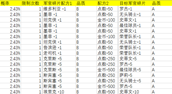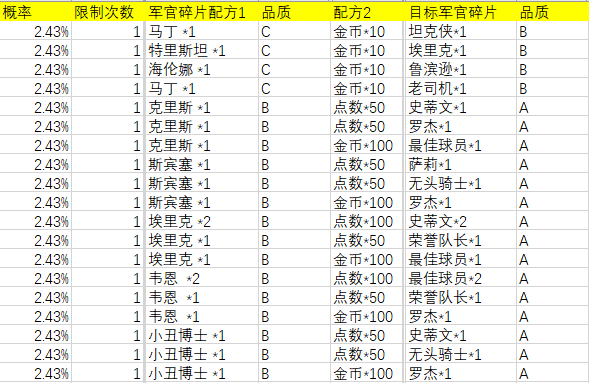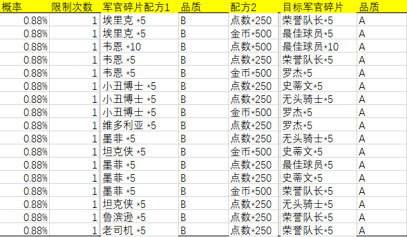 欢乐购配方&概率(军官碎片互换版)