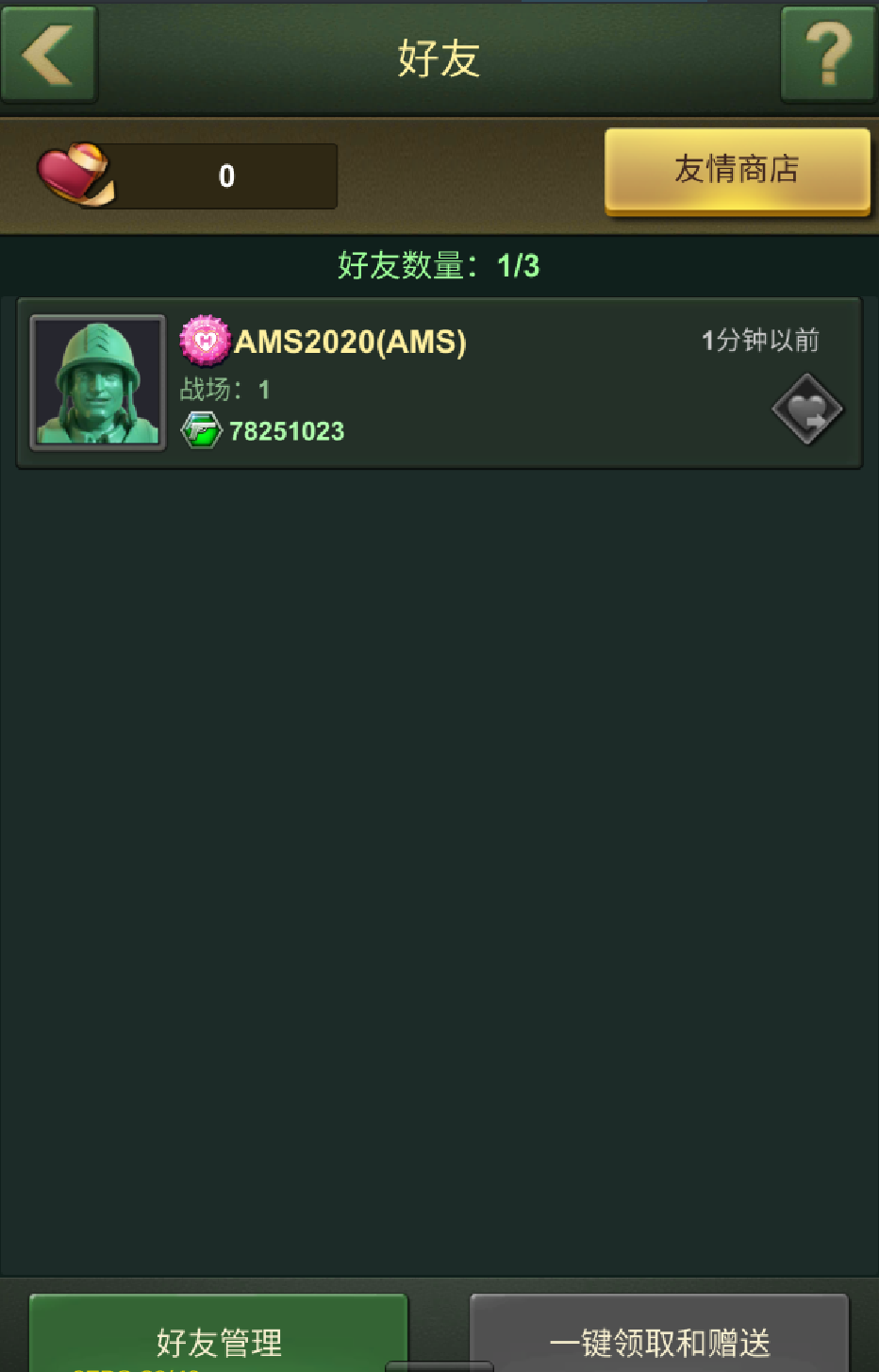 3、点击好友列表的红心图案,即可送给好友「友情点」,同时,绿心图案即表示可以收取好友赠予的「友情点」,友情点可以用于在「友情商店」兑换道具,还可用「一键领取和赠送」快捷操作哦;