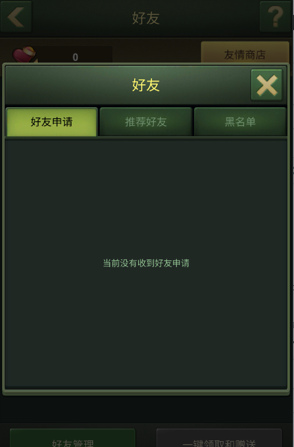 2、点击「好友管理」可查看「好友申请」、「推荐好友」(可在此输入好友昵称搜索后添加)、「黑名单」;