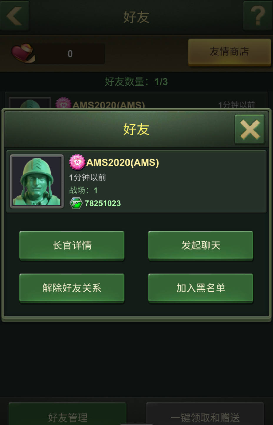 1、点击任意长官的头像进入长官信息界面,即可直接「添加好友」,已添加的好友会显示在好友系统主界面,点击好友头像可快捷操作(查看长官详情、解除好友关系、发起聊天、加入黑名单);
