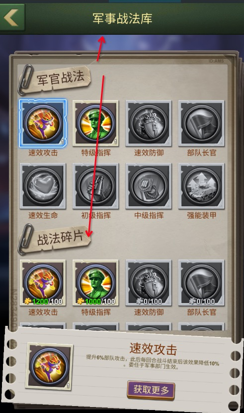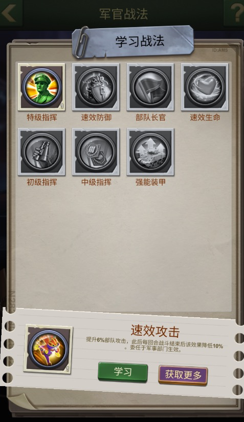 战法库:选择六星军官,点击战法库按钮即可查看当前类型军官所有可学习的战法。