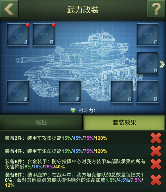 1.每个兵种对应一页武力改装,每页武力改装有八个图纸放置位,在不同放置位装配改装图纸可以为长官的部队提供强力属性增益