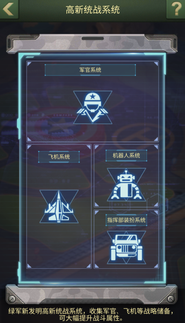 收集游戏中的军官、个性化装饰、飞机和机器人,进行养成和提升获取相应元件,即可提升相应高新统战系统中的属性。