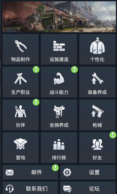 其中包括物品制作、设施建造、个性化装扮、生产职业、战斗能力、装备养成、伙伴培养、坐骑养成、枪械、营地、排行榜和好友列表。