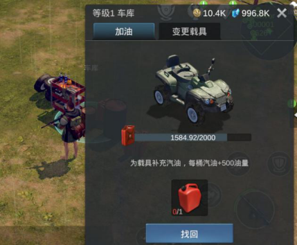 当您在在“建造模式”中解锁并建造了车库之后,就可以在车库中为全地形车加油。对车库进行交互即可弹出加油界面,点击“加油”即可为全地形车加油。加油消耗油箱。
