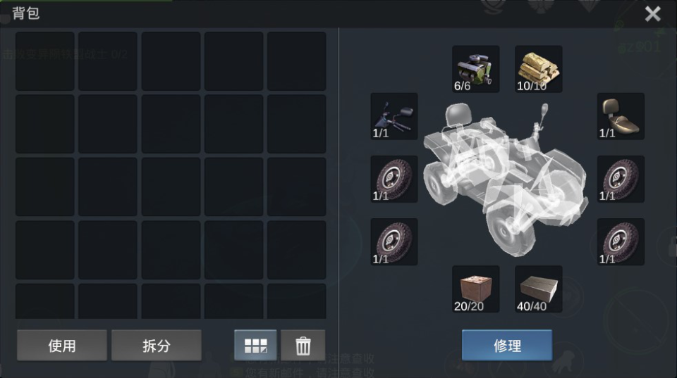 在野外拾起零件,并将其带回营地内,点击全地形车的交互键即可为全地形车添加修理零件。