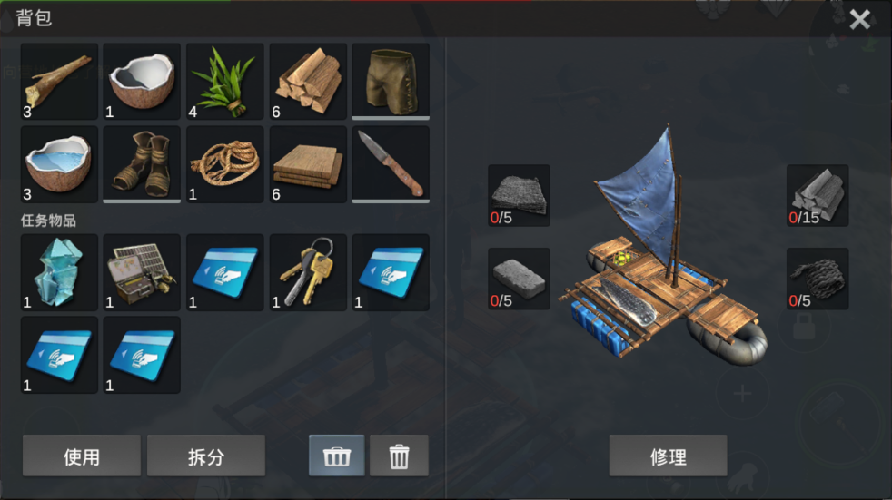 小船需要修理才可正常使用。修理零件可通过采集和生产获得。