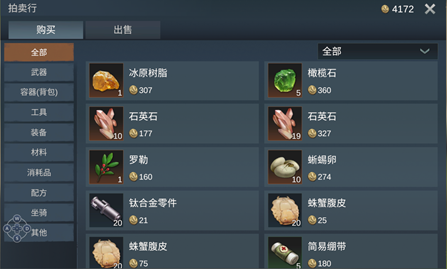 玩家可以在这里浏览和购买其他玩家拍卖的各种物品,其中包括武器、背包、工具、装备、材料、消耗品、配方、坐骑及其他物品。