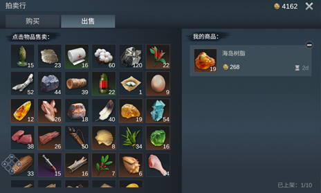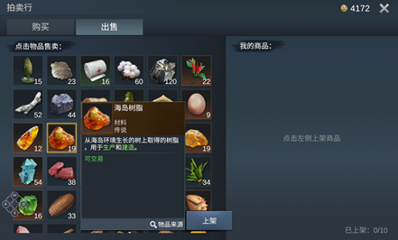 玩家可在出售界面中选择自己背包和储物箱中的物品作为上架商品进行寄售。