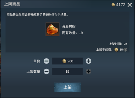 在商品上架时,玩家可以选择上架商品的数量及价格。