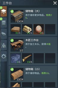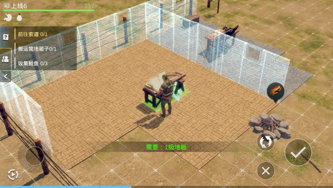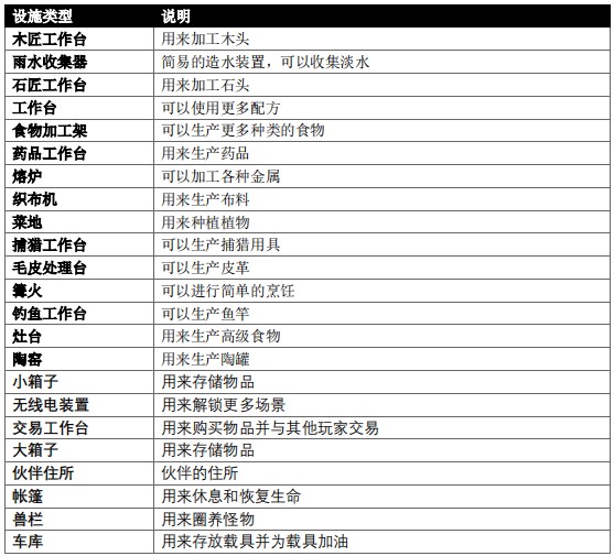 设施需放置在空地上,不同的设施对地面要求不同,如篝火、帐篷等需要放置在没有地板的地面上,而木工台、箱子等则需要放置在铺有地板的地面上。