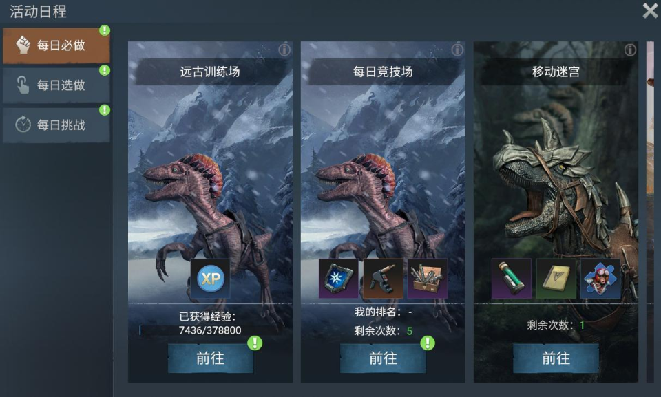 远古训练场入口,由屏幕右上的推荐活动入口进入,然后,在左侧“每日必做”分栏中选择远古试炼场,点击前往规则说明界面。