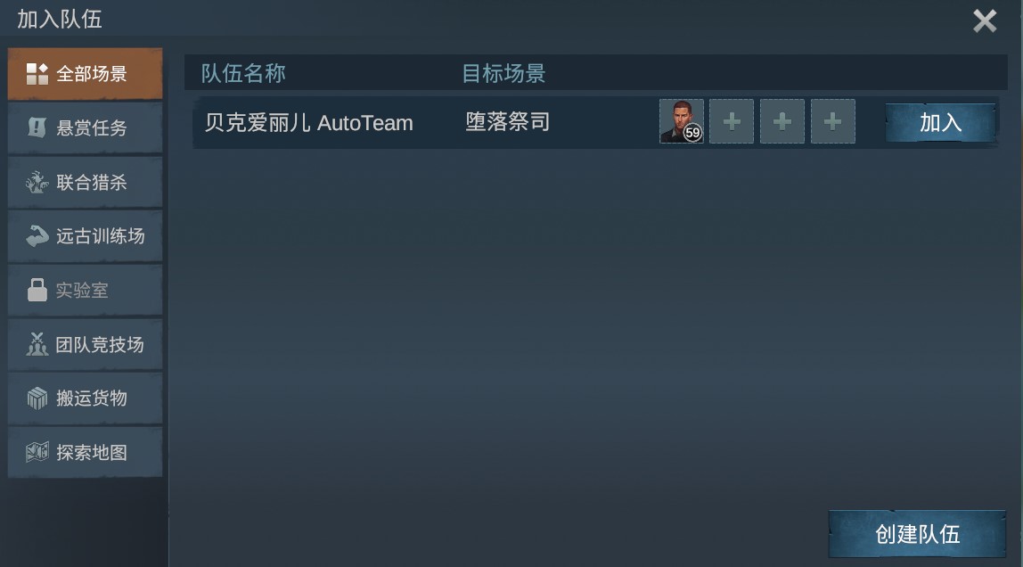 如选择“队伍列表”则会在窗口内显示别人已创建的队伍,点击加入进入队伍。